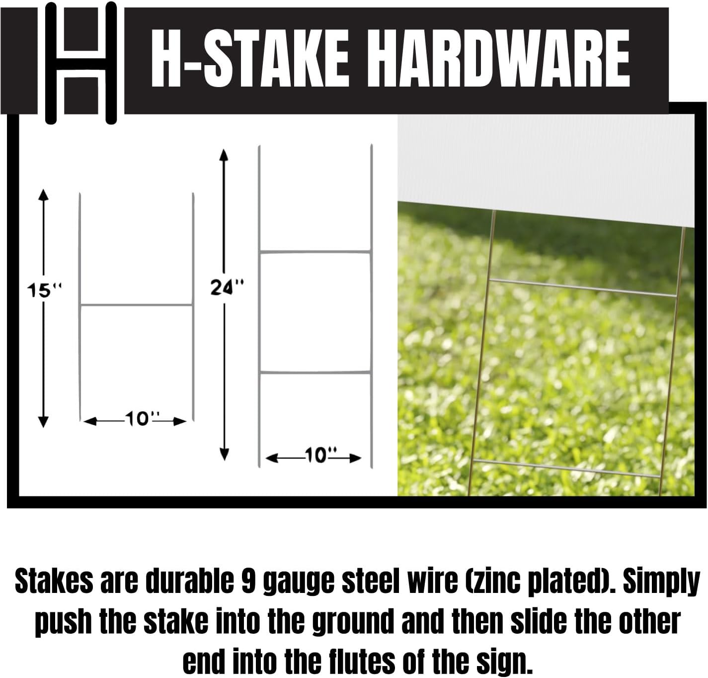 H-stakes included for easy ground installation. Smaller sizes typically include one H-stake, while larger 36×24 inch signs include two H-stakes.